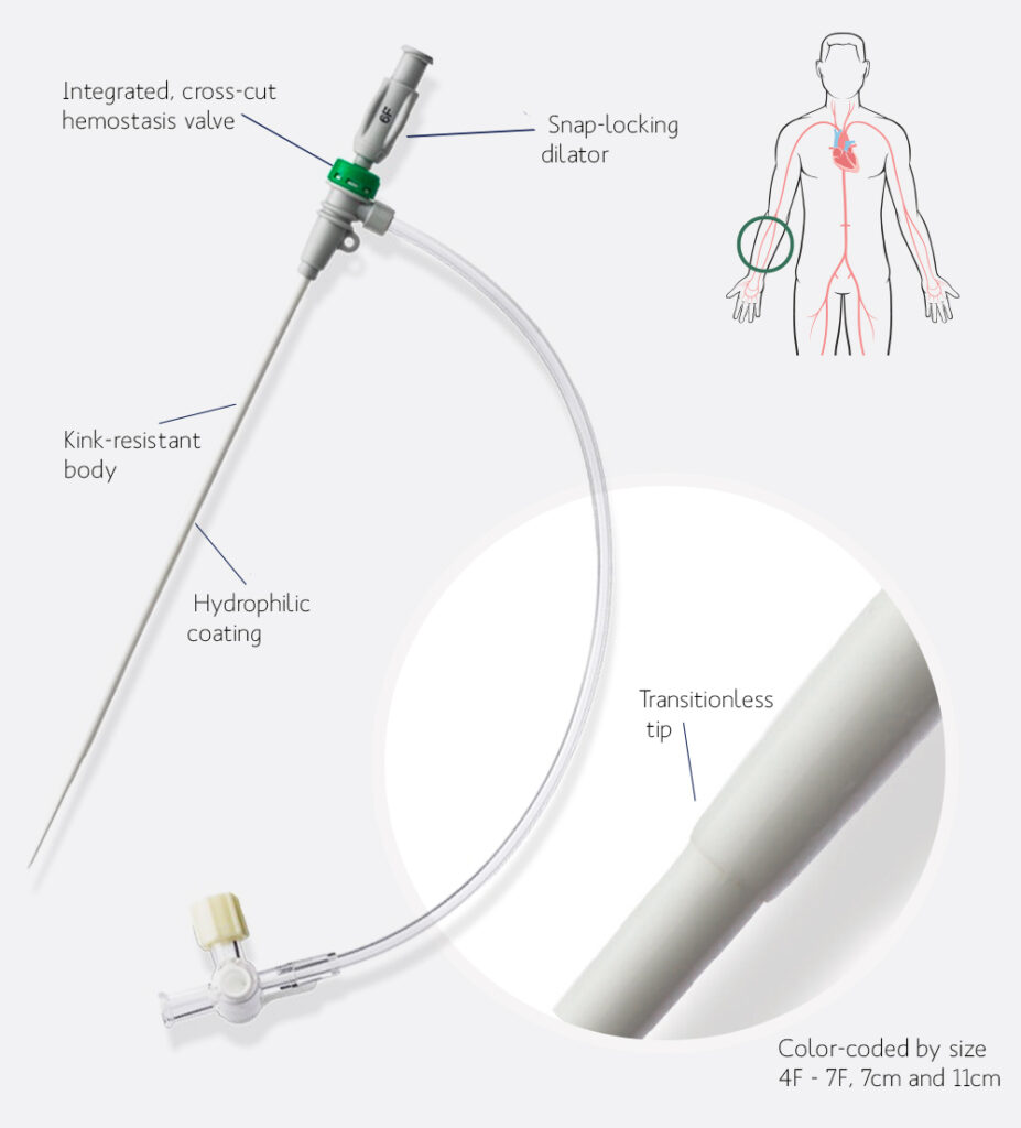 - Transitionless wire-to-dilator and dilator-to-sheath tapers facilitate vascular access with lower penetration forces and minimize tissue trauma.