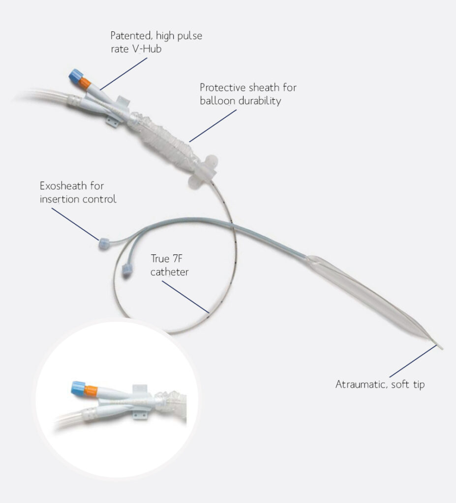• Strong polyurethane balloon and patented V-Hub technology enhance gas flow rates and clinical performance