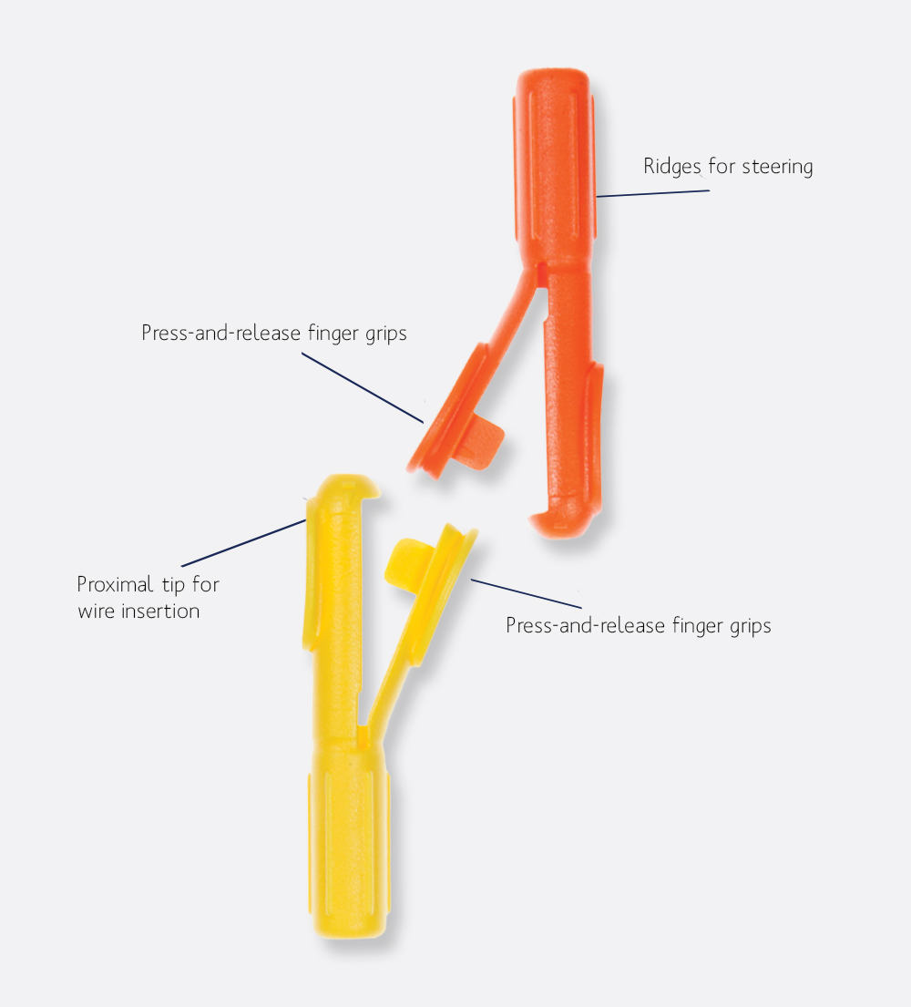 - Quickly insert, adjust, and remove guidewire with press-and-release finger grips